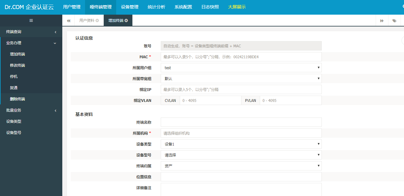 通过企业认证云平台的建设,可实现针对企业不同场景的准入出一体化认证,其中包括对企业内部哑终端的统一管理、组织机构权限的细化分配、不同区域个性化的接入方式,以及企业访客的接入管理,提供全局的认证大屏显示,使管理员能够更加清晰的了解到网络认证的时时动态,以便进行下一步管理工作。