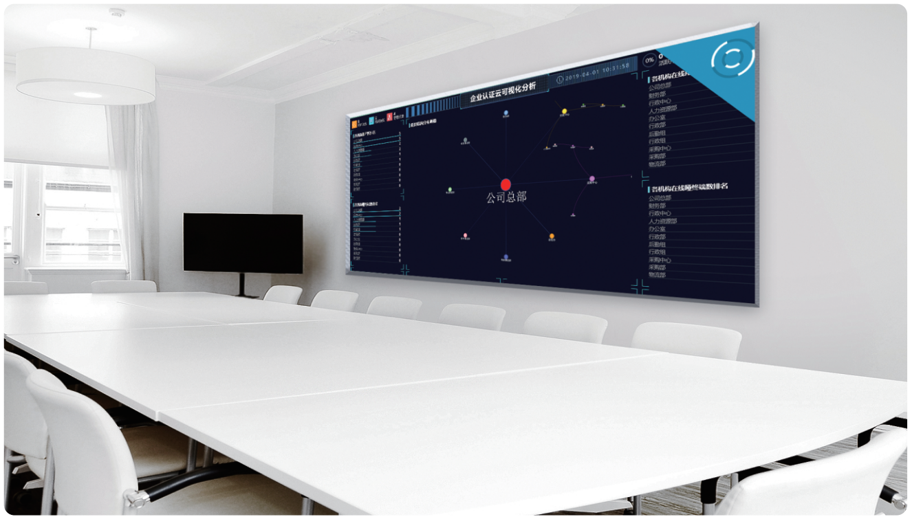 企业安全认证大屏显示 针对集团、园区、分支,可按需部署大屏展示,可将各级部门及分支机构情况统一汇总到中心,通过大屏呈现出分级认证使用情况。
